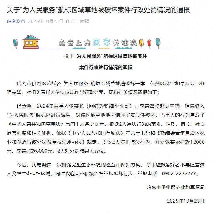 10月23日,据哈密发布微信公众号消息,哈密市伊州区沁城乡“为人民服务”航标区域草地遭破坏一案,伊州区林业和草原局已办理完毕,对相关责任人依法依规作出行政处罚。现将有关情况通报如下: